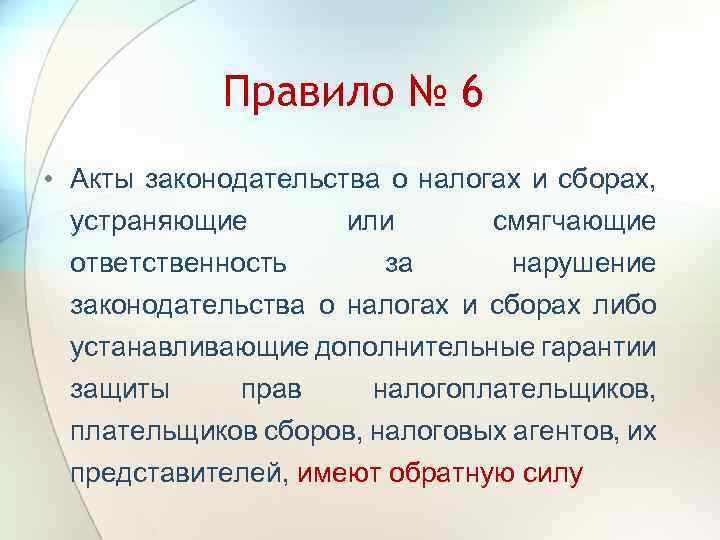 Правило № 6 • Акты законодательства о налогах и сборах, устраняющие или смягчающие ответственность за нарушение законодательства о налогах и сборах либо устанавливающие дополнительные гарантии защиты прав налогоплательщиков, плательщиков сборов, налоговых агентов, их представителей, имеют обратную силу
