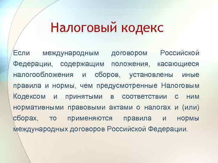 Налоговый кодекс Если международным договором Российской Федерации, содержащим положения, касающиеся налогообложения и сборов, установлены иные правила и нормы, чем предусмотренные Налоговым Кодексом и принятыми в соответствии с ним нормативными правовыми актами о налогах и (или) сборах, то применяются правила и нормы международных договоров Российской Федерации.