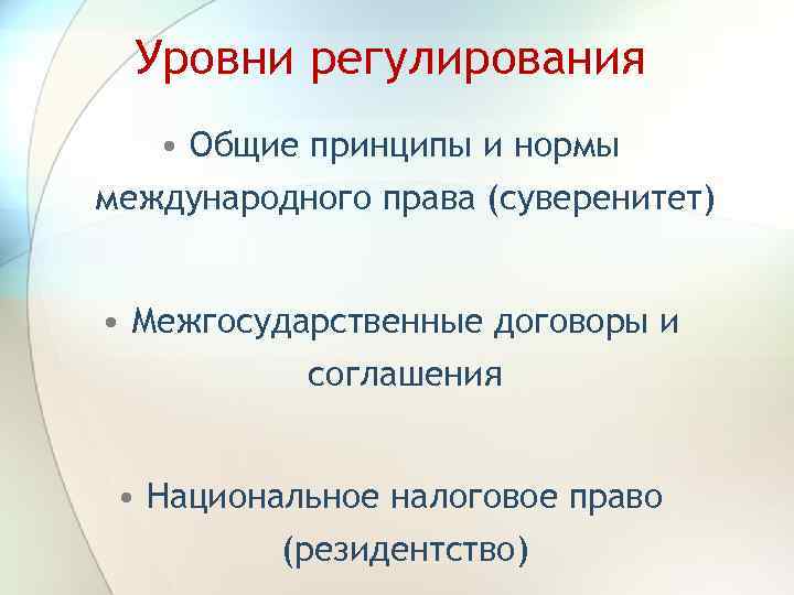 Уровни регулирования • Общие принципы и нормы международного права (суверенитет) • Межгосударственные договоры и соглашения • Национальное налоговое право (резидентство)