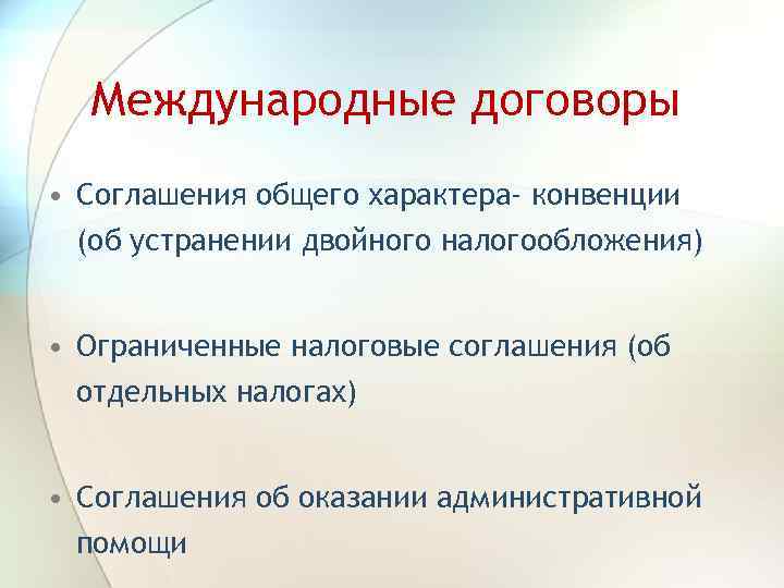 Международные договоры • Соглашения общего характера- конвенции (об устранении двойного налогообложения) • Ограниченные налоговые соглашения (об отдельных налогах) • Соглашения об оказании административной помощи