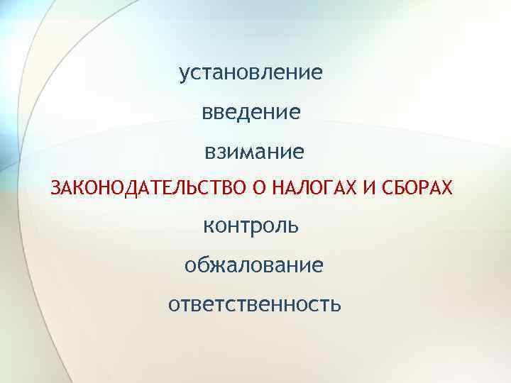 установление введение взимание ЗАКОНОДАТЕЛЬСТВО О НАЛОГАХ И СБОРАХ контроль обжалование ответственность