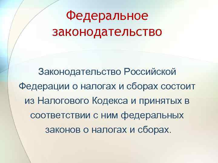 Федеральное законодательство Законодательство Российской Федерации о налогах и сборах состоит из Налогового Кодекса и принятых в соответствии с ним федеральных законов о налогах и сборах.