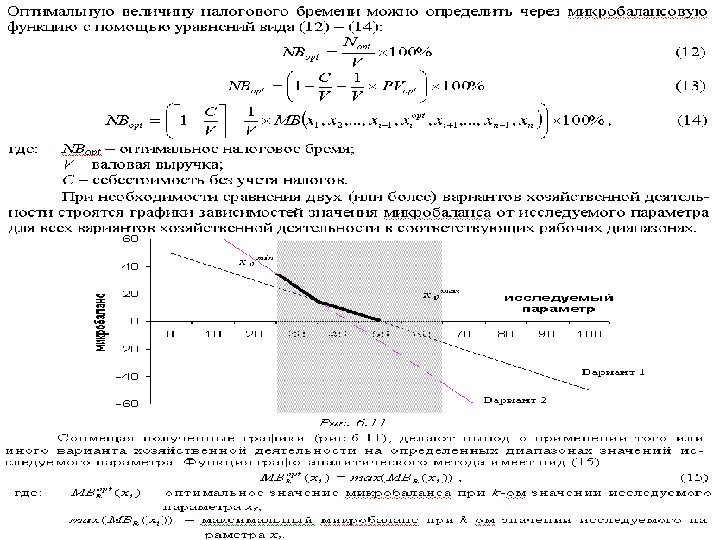 Графо-аналитический метод Теоретические основы графо-аналитического метода Метод графо-аналитических зависимостей применяется совместно с микробалансовым методом налогового планирования и позволяет определить влияние любого параметра хозяйственной операции на результат микробаланса, а следовательно, и на чистую прибыль от данной операции. При этом исследуемым параметром хозяйственной операции может быть как хозяйственный показатель (например, фонд заработной платы, остатки товарных запасов, доля расходов на рекламу, торговая наценка и т. д. ), так и налоговый показатель (например, ставка налога на имущество, срок уплаты налога на добавленную стоимость и т. д. ). Оценив влияние исследуемого показателя на результат микробаланса данной хозяйственной операции можно выбрать его оптимальные, а также допустимые значения. Укрупненно метод графо-аналитических зависимостей выглядит следующим образом. Для исследования выбирается какой-либо показатель. Затем рассчитываются микробалансы при каждом из значений этого показателя и строится графическая зависимость результата микробаланса (чистая прибыль) от изменения исследуемого показателя. Если задачей исследования ставится не количественное, а качественное сравнение нескольких разноплановых вариантов хозяйственной деятельности, то графо-аналитическая зависимость строится для каждого варианта. Далее все графики зависимостей значений микробалансов (для всех вариантов) переносятся на единый график. На полученном графике можно определить области значений исследуемого показателя, при которых выгоднее применять тот или иной вариант. Для изучения влияния i-го параметра хозяйственной операции на результат микробаланса (который, в свою очередь, дает оценку налогового бремени, а следовательно, и чистой прибыли) вычисляются значения микробалансов на всем диапазоне значений исследуемого параметра, при соблюдении условия постоянства значений остальных параметров хозяйственной операции. , (1)