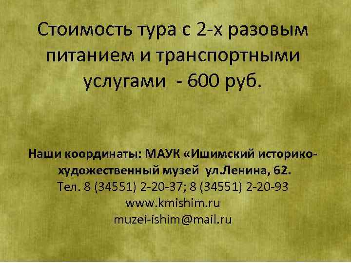 Стоимость тура с 2 -х разовым питанием и транспортными услугами - 600 руб. Наши координаты: МАУК «Ишимский историкохудожественный музей ул. Ленина, 62. Тел. 8 (34551) 2 -20 -37; 8 (34551) 2 -20 -93 www. kmishim. ru muzei-ishim@mail. ru