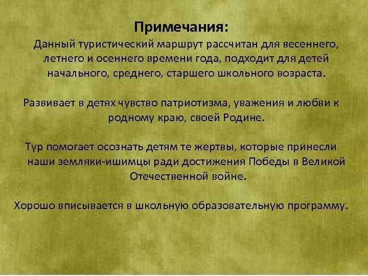 Примечания: Данный туристический маршрут рассчитан для весеннего, летнего и осеннего времени года, подходит для детей начального, среднего, старшего школьного возраста. Развивает в детях чувство патриотизма, уважения и любви к родному краю, своей Родине. Тур помогает осознать детям те жертвы, которые принесли наши земляки-ишимцы ради достижения Победы в Великой Отечественной войне. Хорошо вписывается в школьную образовательную программу.