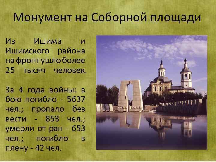 Монумент на Соборной площади Из Ишима и Ишимского района на фронт ушло более 25 тысяч человек. За 4 года войны: в бою погибло - 5637 чел. ; пропало без вести - 853 чел. ; умерли от ран - 653 чел. ; погибло в плену - 42 чел.