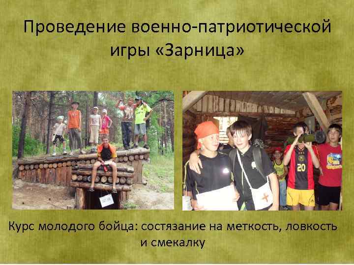 Проведение военно-патриотической игры «Зарница» Курс молодого бойца: состязание на меткость, ловкость и смекалку