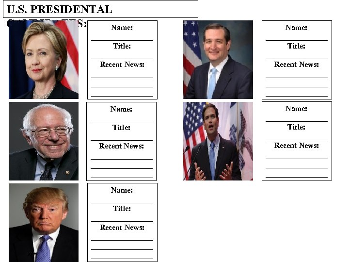 U. S. PRESIDENTAL CANDIDATES: Name: ________________ Title: ________________ Recent News: ________________ ________________ ________________ Name: ________ Title: ________ Recent News: ________________