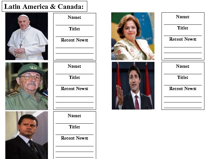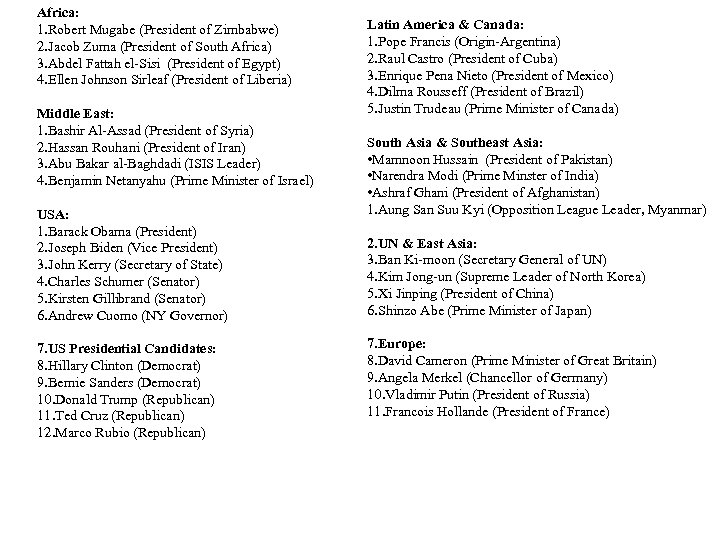 Africa: 1. Robert Mugabe (President of Zimbabwe) 2. Jacob Zuma (President of South Africa) 3. Abdel Fattah el-Sisi (President of Egypt) 4. Ellen Johnson Sirleaf (President of Liberia) Middle East: 1. Bashir Al-Assad (President of Syria) 2. Hassan Rouhani (President of Iran) 3. Abu Bakar al-Baghdadi (ISIS Leader) 4. Benjamin Netanyahu (Prime Minister of Israel) USA: 1. Barack Obama (President) 2. Joseph Biden (Vice President) 3. John Kerry (Secretary of State) 4. Charles Schumer (Senator) 5. Kirsten Gillibrand (Senator) 6. Andrew Cuomo (NY Governor) 7. US Presidential Candidates: 8. Hillary Clinton (Democrat) 9. Bernie Sanders (Democrat) 10. Donald Trump (Republican) 11. Ted Cruz (Republican) 12. Marco Rubio (Republican) Latin America & Canada: 1. Pope Francis (Origin-Argentina) 2. Raul Castro (President of Cuba) 3. Enrique Pena Nieto (President of Mexico) 4. Dilma Rousseff (President of Brazil) 5. Justin Trudeau (Prime Minister of Canada) South Asia & Southeast Asia: • Mamnoon Hussain (President of Pakistan) • Narendra Modi (Prime Minster of India) • Ashraf Ghani (President of Afghanistan) 1. Aung San Suu Kyi (Opposition League Leader, Myanmar) 2. UN & East Asia: 3. Ban Ki-moon (Secretary General of UN) 4. Kim Jong-un (Supreme Leader of North Korea) 5. Xi Jinping (President of China) 6. Shinzo Abe (Prime Minister of Japan) 7. Europe: 8. David Cameron (Prime Minister of Great Britain) 9. Angela Merkel (Chancellor of Germany) 10. Vladimir Putin (President of Russia) 11. Francois Hollande (President of France)