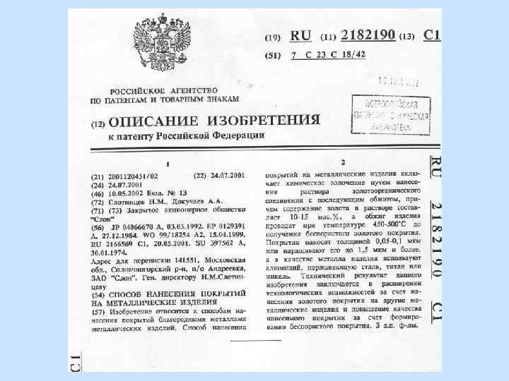 Гальваностегия • Электрохимический эквивалент любого сплава можно найти через эквиваленты Ci входящих в него элементов и через массовое содержание в процентах элемента ki в сплаве: t – время электролиза [час] d – плотность осаждаемого металла [г/см 3] I – плотность тока [А/дм 2] h – выход по току (типа КПД)