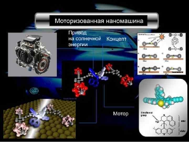 Метод приведения в движение наномашины • Нагрев ее до 200° С, что вызывает вращение фуллеренов на химических связях, соединяющих их с «рамой машины» . От вращения четырех молекул наносистема приходит в движение и может катиться по плоской золотой поверхности. • Ее передвижения связаны с вращением фуллереновколес. • Для наблюдения используют сканирующую туннельную микроскопию (СТМ). Каждую минуту получали СТМ снимки машины, доказывающие, что колеса действительно вращаются