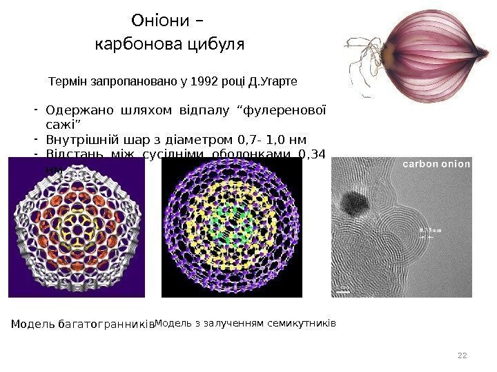 Оніони – карбонова цибуля 22 Термін запропановано у 1992 році Д. Угарте — Одержано шляхом відпалу “фулеренової сажі” — Внутрішній шар з діаметром 0, 7 — 1, 0 нм — Відстань між сусідніми оболонками 0, 34 нм Модель багатогранників Модель з залученням семикутників