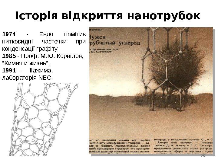 25Історія відкриття нанотрубок 1991 – Ііджима, лабораторія NEC 1974 — Ендо помітив нитковидні часточки при конденсації графіту 1985 — Проф. М. Ю. Корнілов, “ Химия и жизнь”,