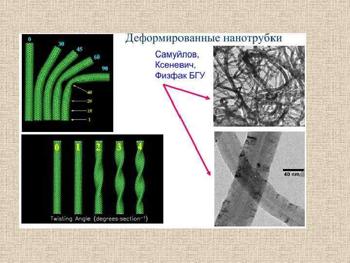 Многослойные нанотрубки • Многослойные нанотрубки отличаются от однослойных значительно более широким разнообразием форм и конфигураций. Возможные разновидности поперечной структуры многослойных нанотрубок представлены на рисунке. Структура типа "русской матрешки") представляет собой совокупность вложенных друг в друга однослойных нанотрубок (а). Другая разновидность этой структуры, показанная на рисунке б, представляет собой совокупность вложенных друг в друга призм. Наконец, последняя из приведённых структур (в), напоминает свиток. .