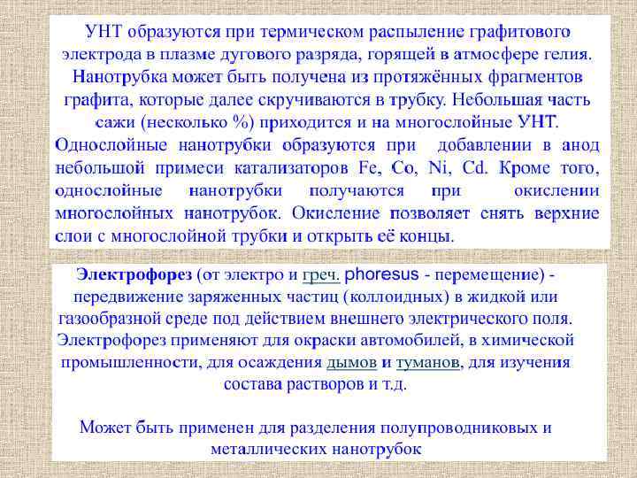 Химическое осаждение из газовой фазы В процессе этого метода готовится подложка со слоем катализатора – частиц металла (чаще всего никеля, кобальта, железа или их комбинаций). Диаметр нанотрубок, выращенных таким способом, зависит от размера металлических частиц. Подложка нагревается примерно до 700 °C. Для инициации роста нанотрубок в реактор вводят два типа газов: технологический газ (например, аммиак, азот, водород и т. д. ) и углеродосодержащий газ (ацитилен, этанол, метан и т. д. ). Нанотрубки начинают расти на участках металлических катализаторов.