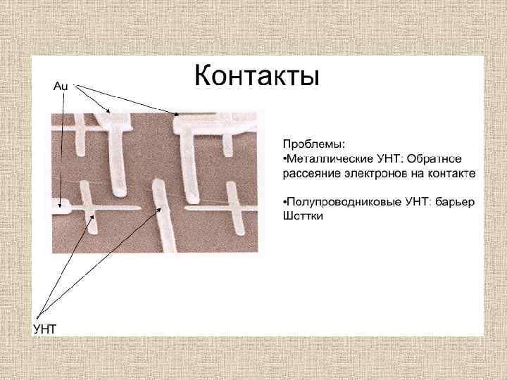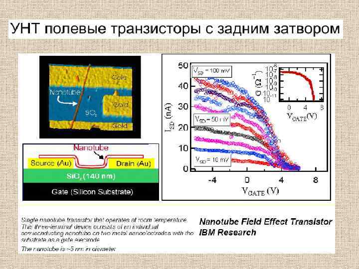 Полевой транзистор. На основе полупроводниковой или металлической нанотрубки удалось сделать полевые транзисторы, работающие при комнатной (в первом случае) и сверхнизкой (во втором) температуре. Полевые транзисторы (триоды) электронные устройства, на перенос заряда через которые оказывает сильное влияние внешнее (управляющее) электрическое поле, что используется в усилителях электрического сигнала, переключателях и т. п. Полевой транзистор на полупроводниковой нанотрубке. Нанотрубка лежит на непроводящей (кварцевой) подложке в контакте с двумя сверхтонкими проводами, в качестве третьего электрода (затвора) используется кремниевый слой (а); зависимость проводимости в цепи от потенциала затвора (б).
