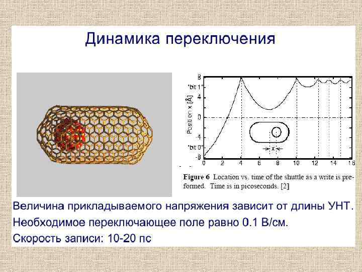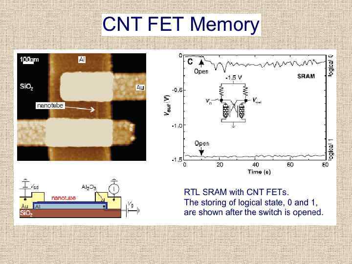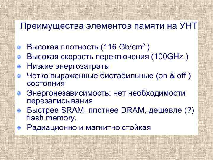 Элементы памяти на УНТ. Исследования технологий хранения информации являются одним из наиболее активно развивающихся направлений в настоящее время. Это обусловлено потребностью хранения все больших объемов информации во всё меньших объемах пространства. Углеродные нанотрубки позволяют изготавливать как совместимые с традиционной кремниевой планарной технологией элементы памяти, так и новые оригинальные элементы. 1. На основе УНТ полевого транзистора (аналогично полупроводниковым элементам памяти) 2. На основе механо-электрической бистсбильности. 3. на основе «спецэффектов» .