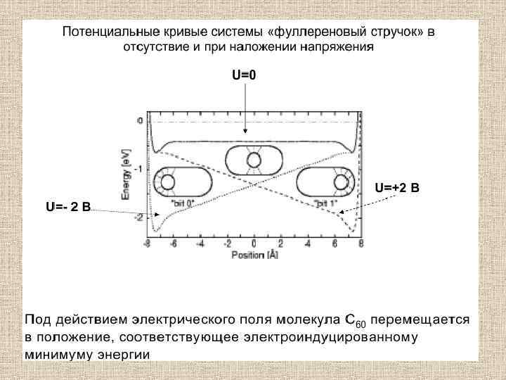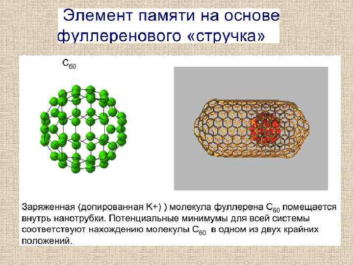 Проводимость Молекулярный кристалл фуллерена является полупроводником с запрещенной зоной ~1. 5 э. В и его свойства во многом аналогичны свойствам других полупроводников. Поэтому ряд исследований был связан с вопросами использования фуллеренов в качестве нового материала для традиционных приложений в электронике: диод, транзистор, фотоэлемент и т. п. Здесь их преимуществом по сравнению с традиционным кремнием является малое время фотоотклика (единицы нс). Однако существенным недостатком оказалось влияние кислорода на проводимость пленок фуллеренов и, следовательно, возникла необходимость в защитных покрытиях. В этом смысле более перспективно использовать молекулу фуллерена в качестве самостоятельного наноразмерного устройства и, в частности, усилительного элемента