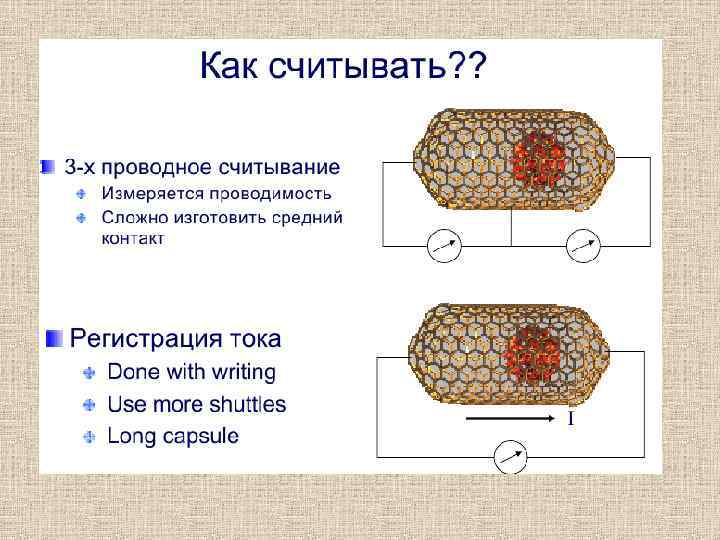 В качестве примера приведем также, создание элементов памяти на основе механических свойств многостенных углеродных нано трубок (рис. ). Для создания элемента памяти вскрываются концы многостенной трубки, а её внешняя оболочка закрепляется между двумя электродами (рис. а). В зависимости от того, левый или правый электрод соединяется с плюсом электрического напряжения, внутренняя часть трубки скользит и притягивается к этому электроду. Таким образом, можно создать как обычную двухпозиционную память (0, 1), так и трехпозиционную (0, 1, 2). Схема работы «механической» памяти