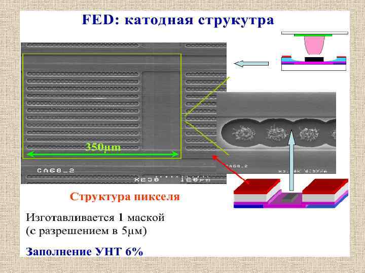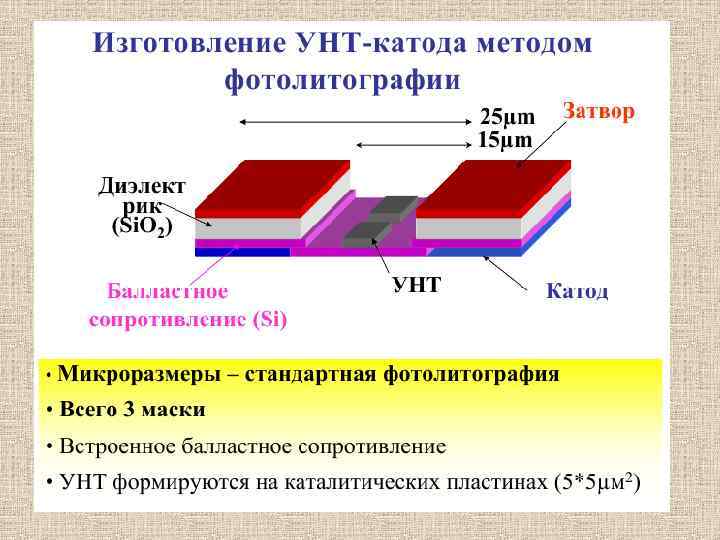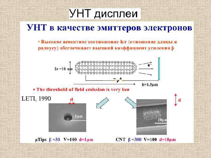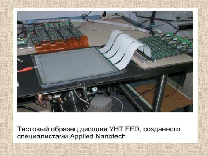 Рассмотрим углеродную нанотрубку, закрепленную на катоде и ориентированную в направлении анода (рис. ). Если на электроды подать напряжение соответствующей полярности, нанотрубка заряжается отрицательно, линии электрического поля вблизи заряженной нанотрубки искривляются и в окрестности острия нанотрубки напряженность поля становится огромной, причем тем больше, чем тоньше нанотрубка. Такое локальное поле может вырывать электроны из нанотрубки. Под действием внешнего поля летящие электроны формируются в пучок. Этот эффект, называемый автоэлектронной эмиссией, кроме дисплеев, используется для создания выпрямителей. Схема дисплея, в котором используется автоэлектронная эмиссия из нанотрубок.