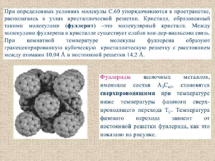 Сверхпроводимость В начале 1991 г. было установлено, что легирование твердого С 60 небольшим количеством щелочного металла приводит к образованию материала с металлической проводимостью, который при низких температурах переходит в сверхпроводник. Легирование С 60 производят путем обработки кристаллов парами металла при температурах в несколько сотен градусов Цельсия. При этом образуется структура типа X 3 С 60 (Х — атом щелочного металла). Первым интеркалированным металлом оказался калий. Переход соединения К 3 С 60 в сверхпроводящее состояние происходит при 19 K.