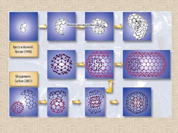 ИСТОРИЯ В середине 60 -х годов Дэвид Джонс конструировал замкнутые сфероидальные клетки из своеобразным образом свернутых графитовых слоев. Было показано, что в качестве дефекта, внедренного в гексагональную решетку обычного графита, может быть пятиугольник. В начале 70 -х годов физхимик–органик Е. Осава предположил существование полой, высокосимметричной молекулы. С 60, со структурой в виде усеченного икосаэдра, похожей на футбольный мяч. Чуть позже (1973 г. ) российские ученые Д. А. Бочвар и Е. Г. Гальперин сделали первые теоретические квантово-химические расчеты такой молекулы и доказали ее стабильность.