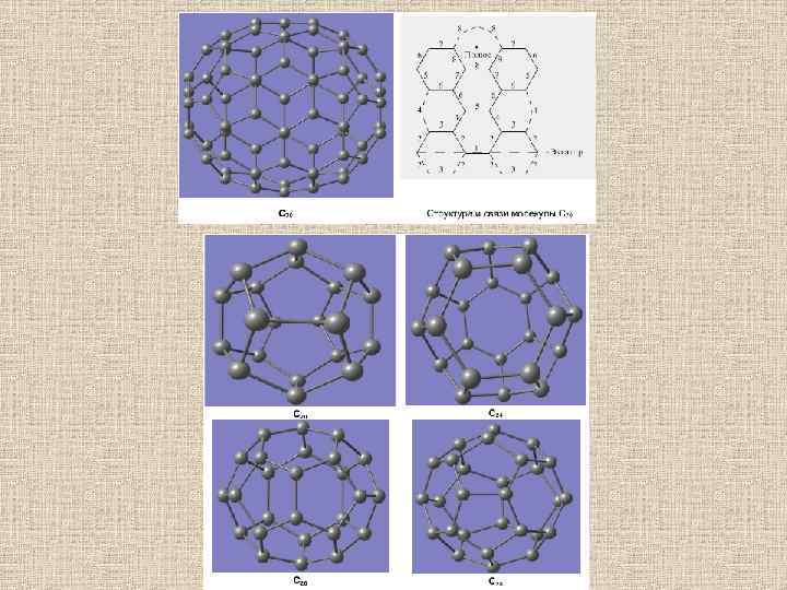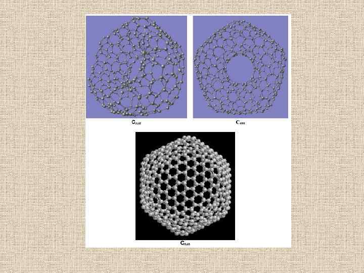 • В противоположность графиту и алмазу, структура которых представляет собой периодическую решетку атомов, третья форма чистого углерода является молекулярной. Это означает, что минимальным элементом ее структуры является не атом, а молекула углерода, представляющая собой замкнутую поверхность, которая имеет форму сферы. • В фуллерене плоская сетка шестиугольников (графитовая сетка) свернута и сшита в замкнутую сферу. При этом часть шестиугольников преобразуется в пятиугольники. Образуется структура – усеченный икосаэдр. Каждая вершина этой фигуры имеет трех ближайших соседей. Каждый шестиугольник граничит с тремя шестиугольниками и тремя пятиугольниками, а каждый пятиугольник граничит только с шестиугольниками. • Фуллерены с n< 60 оказались неустойчивыми, хотя из чисто топологических соображений наименьшим возможным фуллереном является правильный додекаэдр С 20.