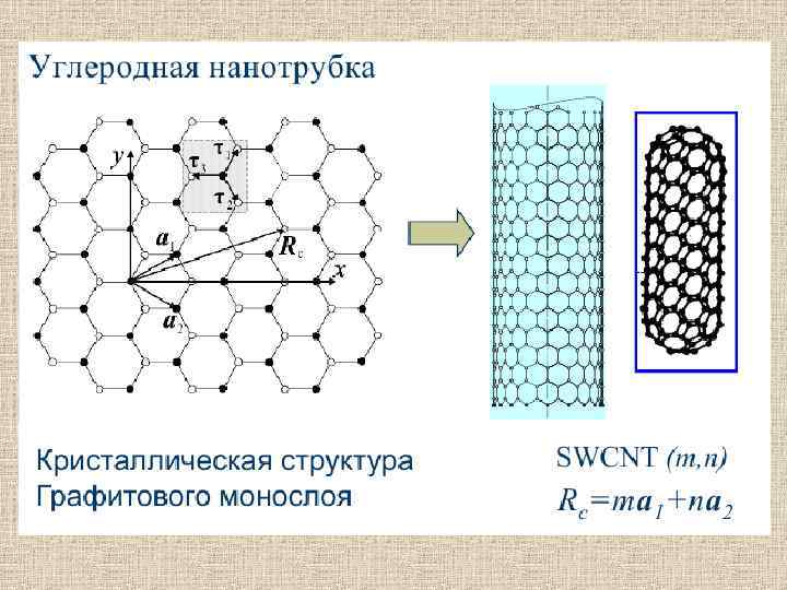 Хиральность нанотрубок обозначается набором символов (m, n), указывающих координаты шестиугольника, который в результате сворачивания плоскости должен совпасть с шестиугольником, находящимся в начале координат. Индексы хиральности однослойной нанотрубки однозначным образом определяют ее диаметр D: dо = 0, 142 нм — расстояние между соседними атомами углерода в графитовой плоскости