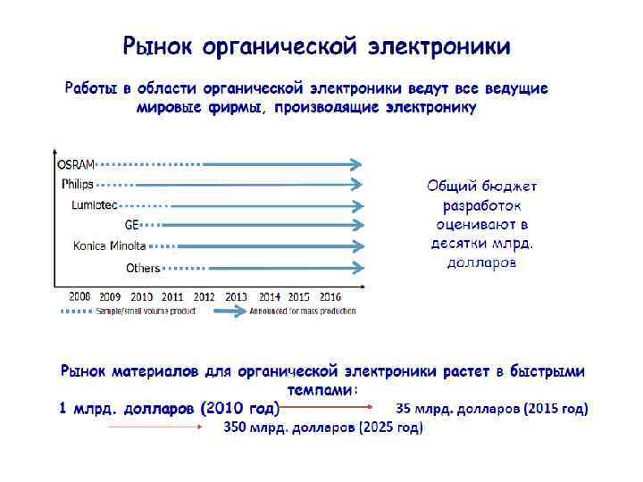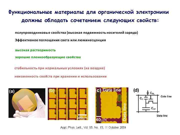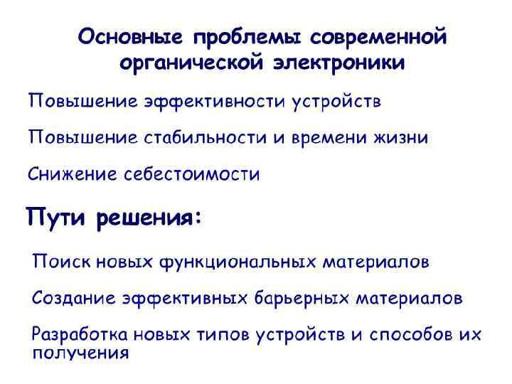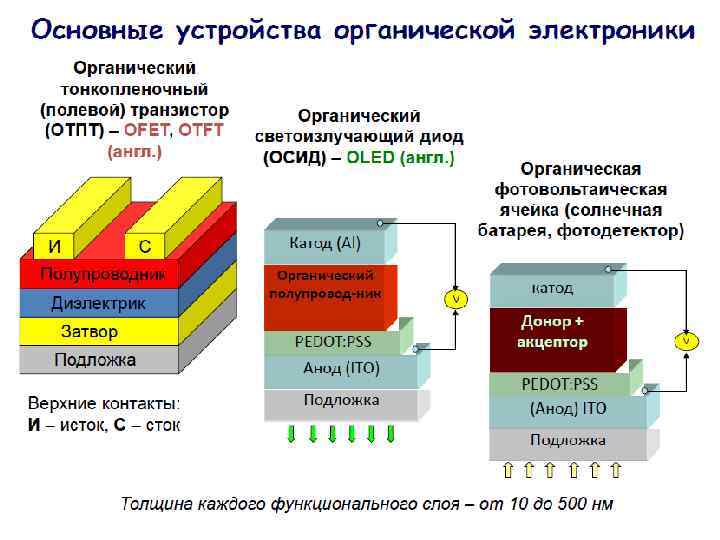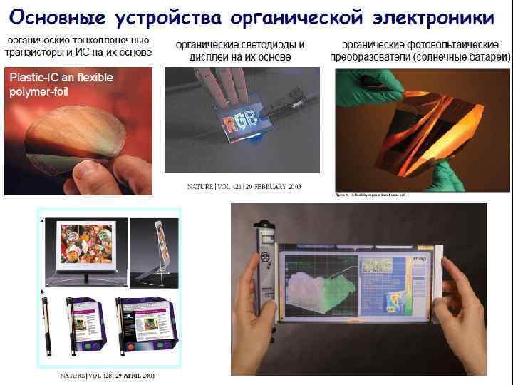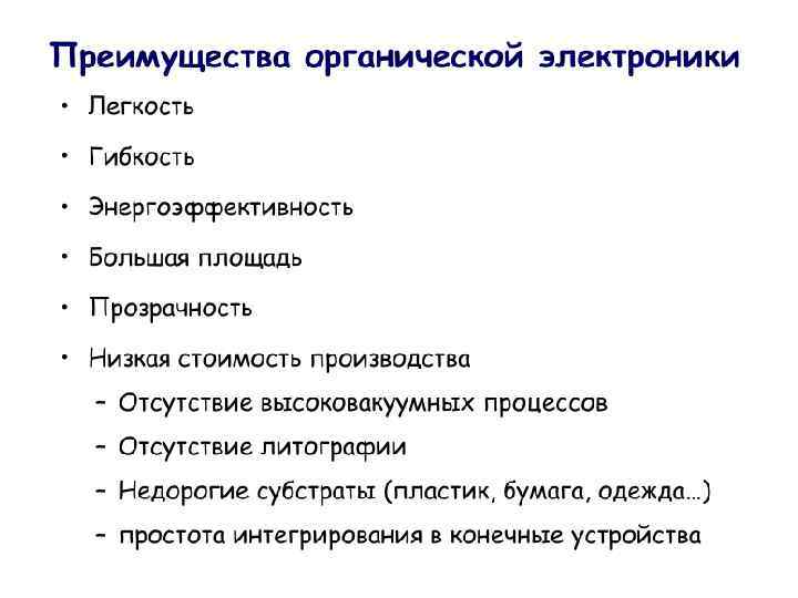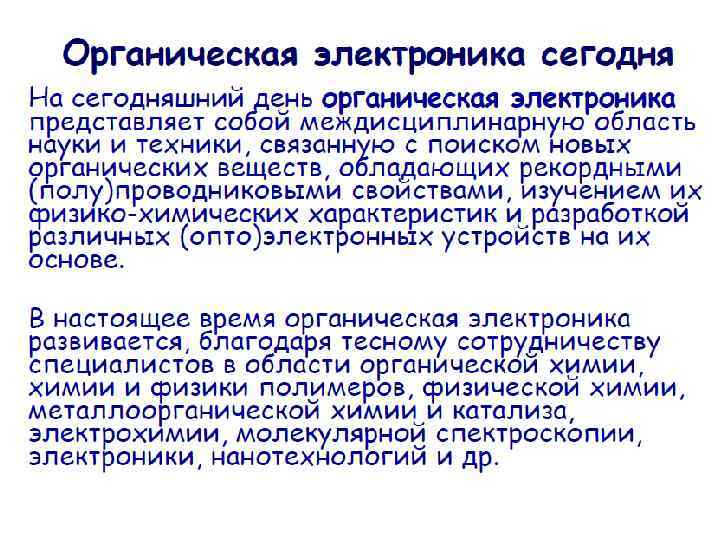 Макромолекулярная электроника В малекулярной электронике выделяют два основных направления: микромолекулярная электроника (или просто молекулярная электроника) и макромолекулярная электроника (или органическая электроника). Макромолекулярная электроника – это электроника в которой в качестве элементов схем используются тонкие (20 -200 нм) пленки органических материалов.