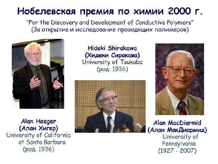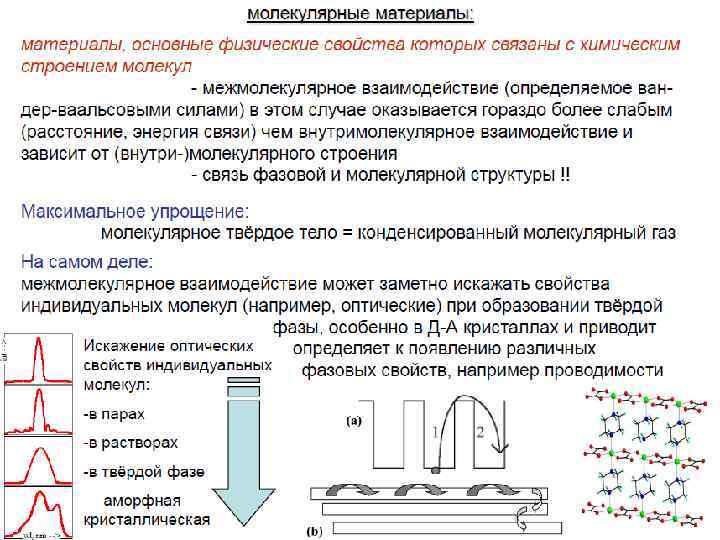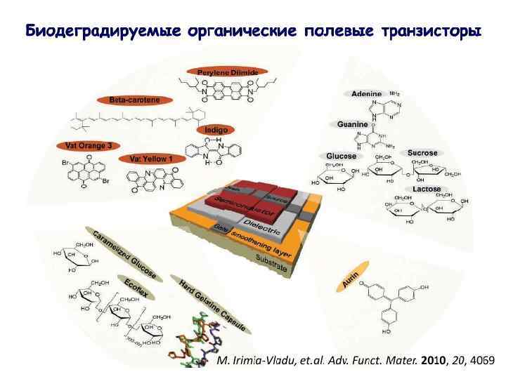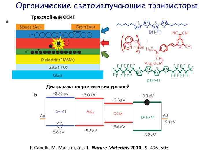 Молекулы транзисторы Первый полевой транзистор на основе ПА был создан в 1980 г. , его структура и характеристики показаны на рис. Он состоял из неорганических контактов, оксидного слоя, полупроводниковым слоем был транс ПА р-типа. Сопоставляя полученные характеристики с теоретическими можно получить важный параметр полимера, который характеризует его быстродействие. подвижность инжектированных носителей (µ). Для первого транзистора значения µ были достаточно малы µ~10 -4 -10 -2 см 2/Вс и частота переключения ~µ/L 2 (где L-длина канала) составляла 100 к. Гц. Особенностью данного транзистора является его способность модулировать оптическое пропускание (поскольку при инжекции дырок Полевой транзистор на основе возникает солитонная полоса полиацетилена, его ВАХ и спектр поглощения). поглощения в зависимости от смещения.