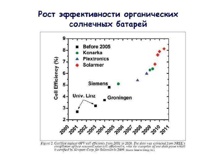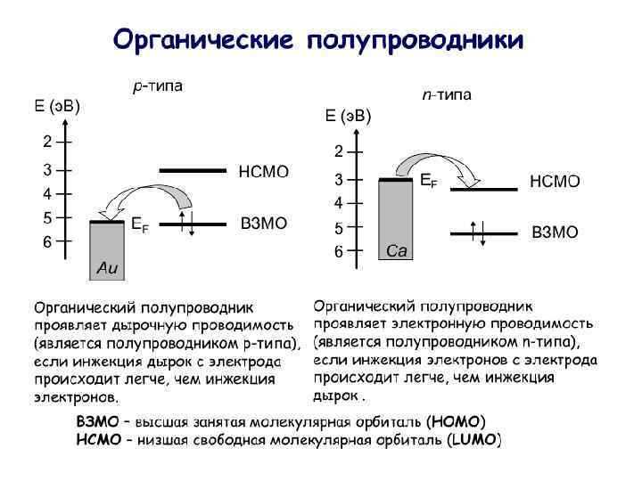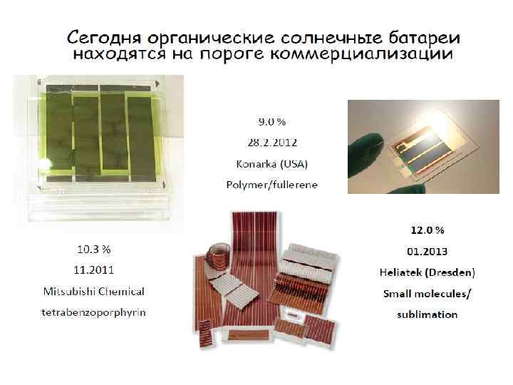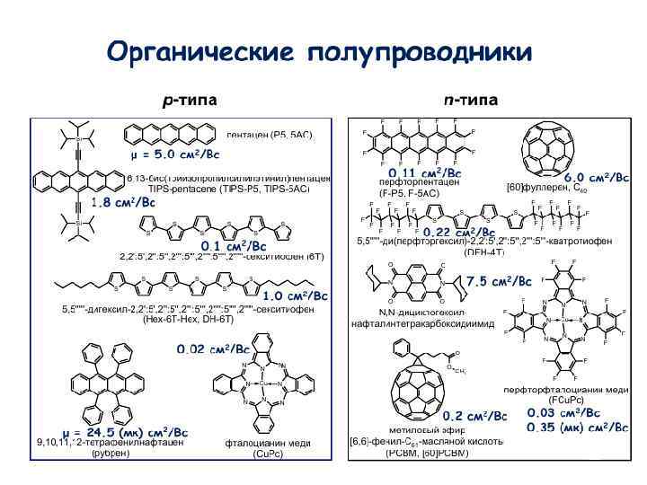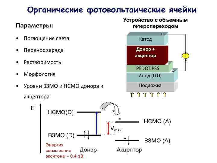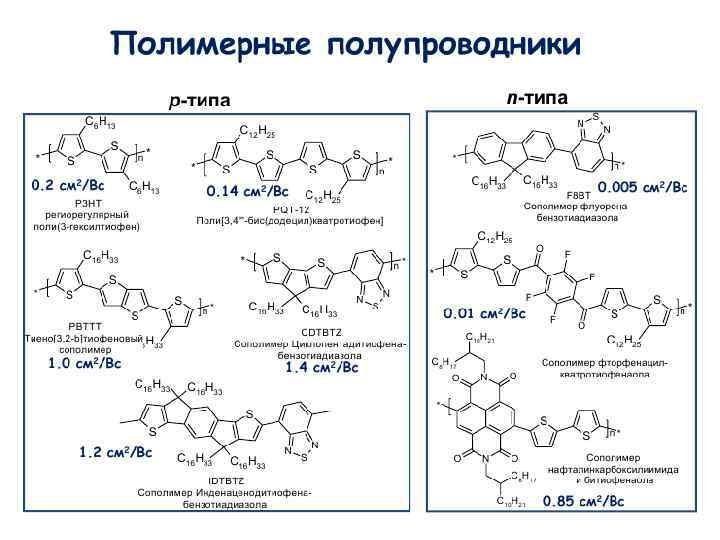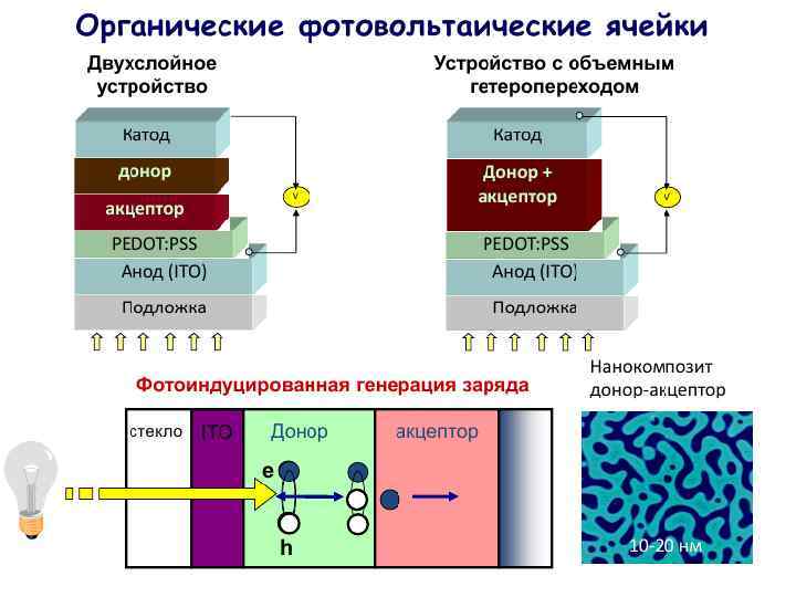 Органические фотодиады. Первоначально в 80 -е годы созданные фотодиоды на барьерах Шоттки давали небольшой квантовый выход η~0. 7 % (электрон/фотон). В дальнейшем стали изготавливать структуры с полимерными р-п переходами, содержащие р и п органические полупроводники. На рис. а и б показан полимерный многослойный фотодиод, содержащий производную полифенилевинилена в качестве донорного слоя и производную политиофена в качестве акцепторного слоя, в этом приборе в режиме разомкнутой цепи достигается η~4. 8 %. а - производная полифенилевинилена (MEH-CN-PPV) и производная политиофена (POPT). б - многослойный фотодиод