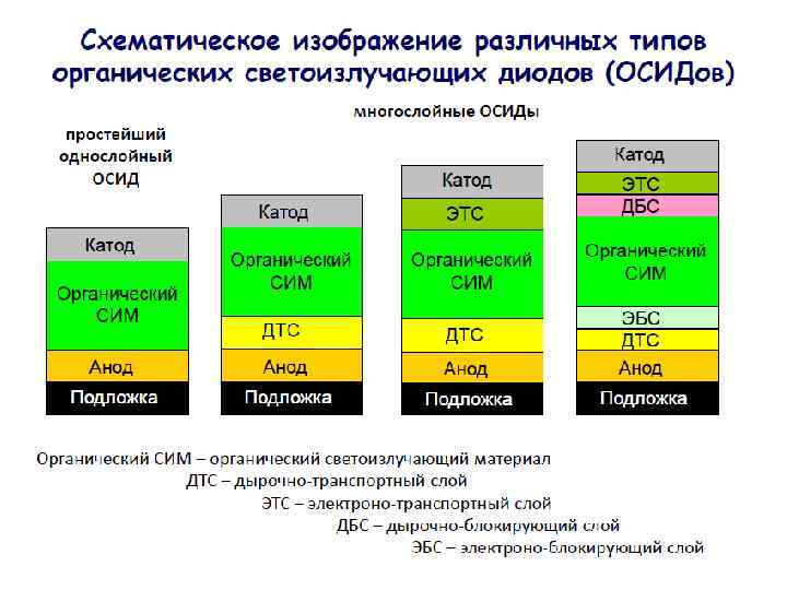 Полимеры, используемые для создания СД, и поперечное сечение полимерного светодиода