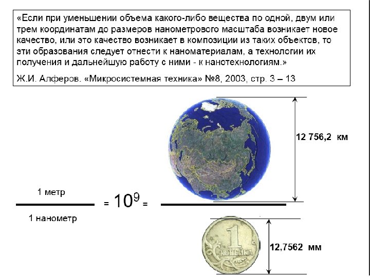 Нанотехнологии • Нанотехнология-совокупность методов и приемов, обеспечивающих возможность контролируемым образом • создавать и модифицировать объекты, включающие компоненты с размерами менее 100 нм, хотя бы в одном измерении , в результате этого получившие принципиально новые качества , позволяющие осуществлять их интеграцию в полноценно функционирующие системы большого масштаба. • Классические методы производства подходят к своему естественному экономическому и технологическому барьеру, когда размер устройства уменьшается ненамного, зато экономические расходы возрастают экспоненциально. • Нанотехнология – следующий логический шаг развития электроники и других наукоемких производств.