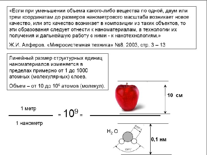 • К наноматериалам условно относят дисперсные и массивные материалы, содержащие структурные элементы (зерна, кристаллиты, блоки, кластеры), геометрические размеры которых хотя бы в одном измерении не превышают 100 нм, и обладающие качественно новыми свойствами, функциональными и эксплуатационными характеристиками. К нанотехнологиям можно отнести технологии, обеспечивающие возможность контролируемым образом создавать и модифицировать наноматериалы, а также осуществлять их интеграцию в полноценно функционирующие системы большего масштаба.