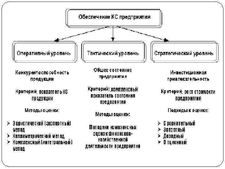 Как оценить конкурентоспособность фирмы? Анализ по функциональным зонам (или оценка потенциала организации) производство: число и географическое размещение производственных площадей, оценка системы контроля качества, степень развития инфраструктуры, степень износа оборудования, возможности расширения производства, производительность труда рабочих, уровень используемых технологий, фондоотдача, ресурсоемкость производства и т. д. ; финансы: уровень издержек, прибыльность, скорость оборота капитала, финансовая устойчивость, выплаты дивидендов по акциям, ликвидность, финансовая зависимость, уровень кредиторской и дебиторской задолженностей и др. ; маркетинг: уровень проводимых рыночных исследований, затраты на участие в выставках, затраты на рекламу, эффективность маркетинга, степень дифференциации продукта, лояльность покупателей, имидж компании, качество поступающей о рынке информации, доля рынка и т. д. ; сбыт: число и географическое размещение сбытовых отделений, протяженность каналов распределения, надежность сбытовых каналов, гибкость посредников, степень зависимости посредников и т. д.