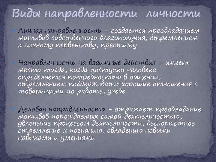 Виды направленности личности Личная направленность - создается преобладанием мотивов собственного благополучия, стремлением к личному первенству, престижу Направленность на взаимные действия - имеет место тогда, когда поступки человека определяется потребностью в общении, стремлением поддерживать хорошие отношения с товарищами по работе, учебе Деловая направленность - отражает преобладание мотивов порождаемых самой деятельностью, увлечение процессом деятельности, бескорыстное стремление к познанию, овладению новыми навыками и умениями
