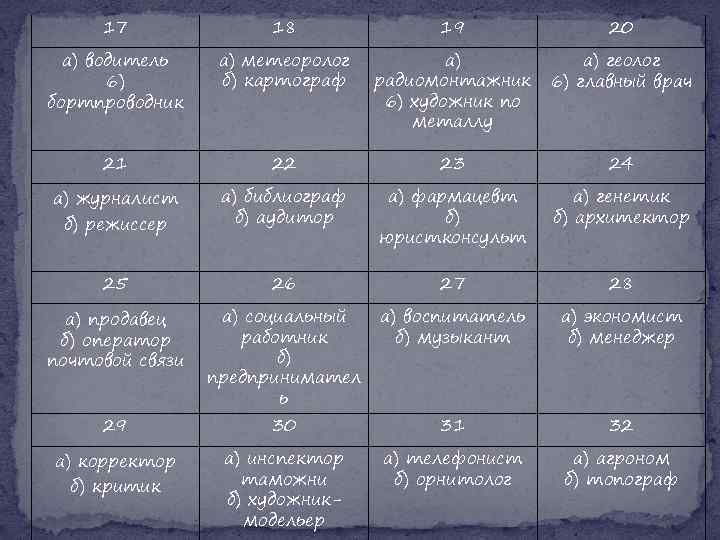 17 18 19 20 а) водитель 6) бортпроводник а) метеоролог б) картограф а) радиомонтажник 6) художник по металлу а) геолог 6) главный врач 21 22 23 24 а) журналист а) библиограф б) аудитор а) фармацевт б) юристконсульт а) генетик б) архитектор 25 26 27 28 а) продавец б) оператор почтовой связи а) социальный работник б) предпринимател ь а) воспитатель б) музыкант а) экономист б) менеджер 30 31 32 а) инспектор таможни б) художникмодельер а) телефонист б) орнитолог а) агроном б) топограф б) режиссер 29 а) корректор б) критик