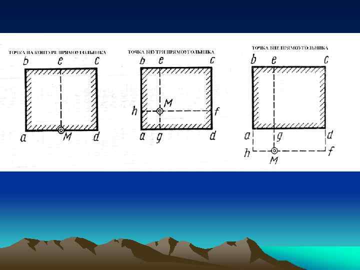Точка на контуре прямоугольника: Сжимающее напряжение находится как сумма двух угловых напряжений, соответствующих прямоугольникам Мabe и Mecd. z= (K 1 c + K 2 c)*p Точка внутри прямоугольника: Суммируются угловые напряжения прямоугольников Mgah, Mhbe, Mecf и Mfdg z= (K 1 c + K 2 c + K 3 c + K 4 c)*p Точка вне прямоугольника: Напряжение в точке М складывается из суммы напряжений от прямоугольников Mhbe Mecf со знаком «+» и от Mhag и Mgdf со знаком «-» z= (K 1 c + K 2 c - K 3 c - K 4 c)*p