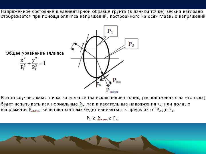 Главные напряжения Наибольшие и наименьшие нормальные напряжения, наблюдаются на площадках расположенных по вертикальной оси. Для таких площадок `=- /2 и, следовательно, угол = /2 /2=0. Тогда, согласно схемы, при =0: 1= (p/ )*( +sin ) 2= (p/ )*( -sin ) По главным напряжением принято строить эллипсы напряжений. В каждом эллипсе длинная осьнаибольшее напряжение, короткая- наименьшее напряжение. Главные напряжения- нормальные напряжения при касательных, равных нулю (см. круги Мора).