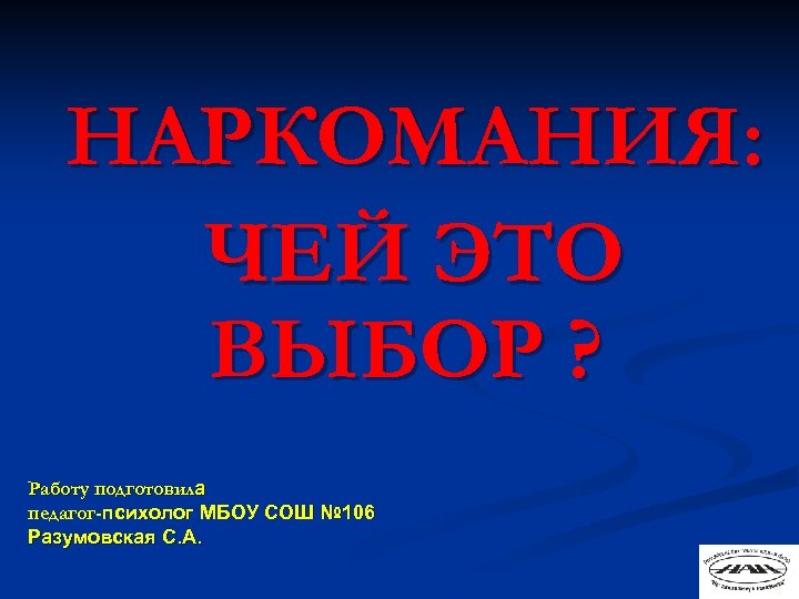 НАРКОМАНИЯ: ЧЕЙ ЭТО ВЫБОР ? Работу подготовила педагог-психолог МБОУ СОШ № 106 Разумовская С. А.