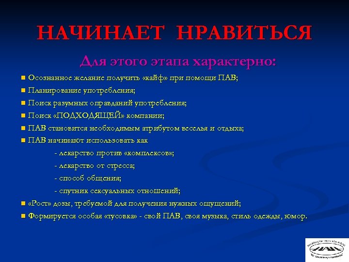 НАЧИНАЕТ НРАВИТЬСЯ Для этого этапа характерно: Осознанное желание получить «кайф» при помощи ПАВ; n Планирование употребления; n Поиск разумных оправданий употребления; n Поиск «ПОДХОДЯЩЕЙ» компании; n ПАВ становится необходимым атрибутом веселья и отдыха; n ПАВ начинают использовать как - лекарство против «комплексов» ; - лекарство от стресса; - способ общения; - спутник сексуальных отношений; n «Рост» дозы, требуемой для получения нужных ощущений; n Формируется особая «тусовка» - свой ПАВ, своя музыка, стиль одежды, юмор. n