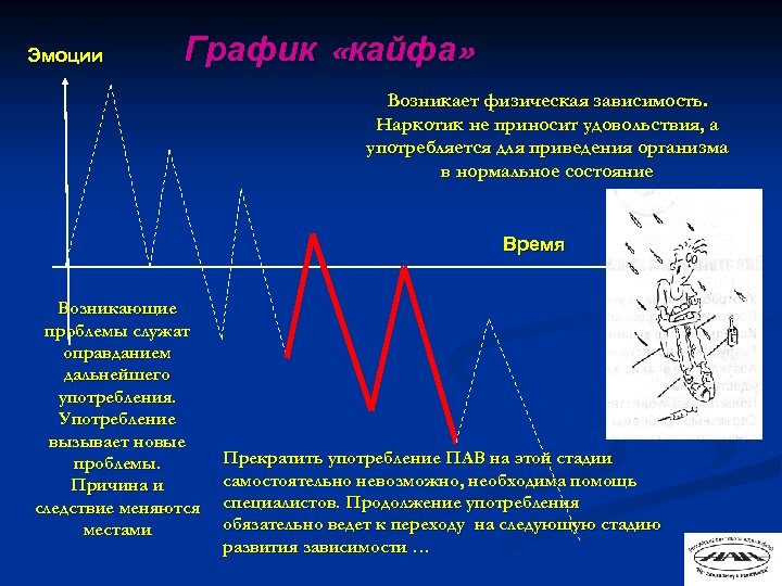 Эмоции График «кайфа» Возникает физическая зависимость. Наркотик не приносит удовольствия, а употребляется для приведения организма в нормальное состояние Время Возникающие проблемы служат оправданием дальнейшего употребления. Употребление вызывает новые проблемы. Причина и следствие меняются местами Прекратить употребление ПАВ на этой стадии самостоятельно невозможно, необходима помощь специалистов. Продолжение употребления обязательно ведет к переходу на следующую стадию развития зависимости …