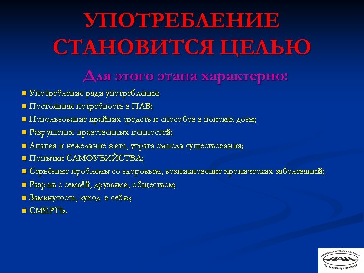 УПОТРЕБЛЕНИЕ СТАНОВИТСЯ ЦЕЛЬЮ Для этого этапа характерно: Употребление ради употребления; n Постоянная потребность в ПАВ; n Использование крайних средств и способов в поисках дозы; n Разрушение нравственных ценностей; n Апатия и нежелание жить, утрата смысла существования; n Попытки САМОУБИЙСТВА; n Серьёзные проблемы со здоровьем, возникновение хронических заболеваний; n Разрыв с семьёй, друзьями, обществом; n Замкнутость, «уход в себя» ; n СМЕРТЬ. n
