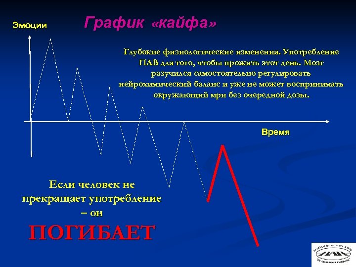 Эмоции График «кайфа» Глубокие физиологические изменения. Употребление ПАВ для того, чтобы прожить этот день. Мозг разучился самостоятельно регулировать нейрохимический баланс и уже не может воспринимать окружающий мри без очередной дозы. Время Если человек не прекращает употребление – он ПОГИБАЕТ