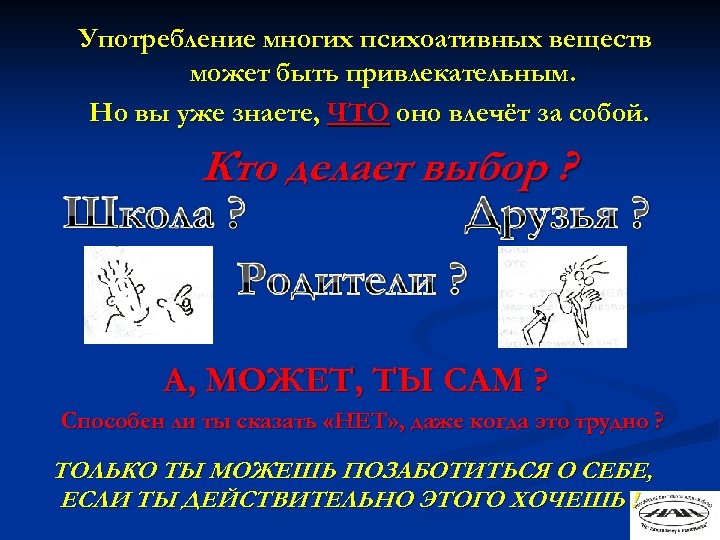 Употребление многих психоативных веществ может быть привлекательным. Но вы уже знаете, ЧТО оно влечёт за собой. Кто делает выбор ? А, МОЖЕТ, ТЫ САМ ? Способен ли ты сказать «НЕТ» , даже когда это трудно ? ТОЛЬКО ТЫ МОЖЕШЬ ПОЗАБОТИТЬСЯ О СЕБЕ, ЕСЛИ ТЫ ДЕЙСТВИТЕЛЬНО ЭТОГО ХОЧЕШЬ !