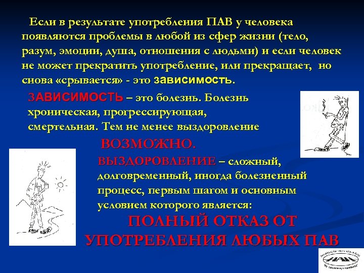 Если в результате употребления ПАВ у человека появляются проблемы в любой из сфер жизни (тело, разум, эмоции, душа, отношения с людьми) и если человек не может прекратить употребление, или прекращает, но снова «срывается» - это зависимость. ЗАВИСИМОСТЬ – это болезнь. Болезнь хроническая, прогрессирующая, смертельная. Тем не менее выздоровление ВОЗМОЖНО. ВЫЗДОРОВЛЕНИЕ – сложный, долговременный, иногда болезненный процесс, первым шагом и основным условием которого является: ПОЛНЫЙ ОТКАЗ ОТ УПОТРЕБЛЕНИЯ ЛЮБЫХ ПАВ