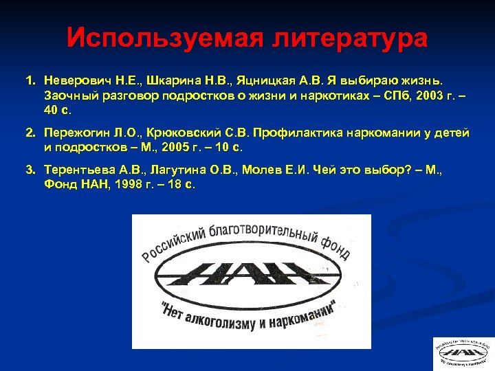 Используемая литература 1. Неверович Н. Е. , Шкарина Н. В. , Яцницкая А. В. Я выбираю жизнь. Заочный разговор подростков о жизни и наркотиках – СПб, 2003 г. – 40 с. 2. Пережогин Л. О. , Крюковский С. В. Профилактика наркомании у детей и подростков – М. , 2005 г. – 10 с. 3. Терентьева А. В. , Лагутина О. В. , Молев Е. И. Чей это выбор? – М. , Фонд НАН, 1998 г. – 18 с.