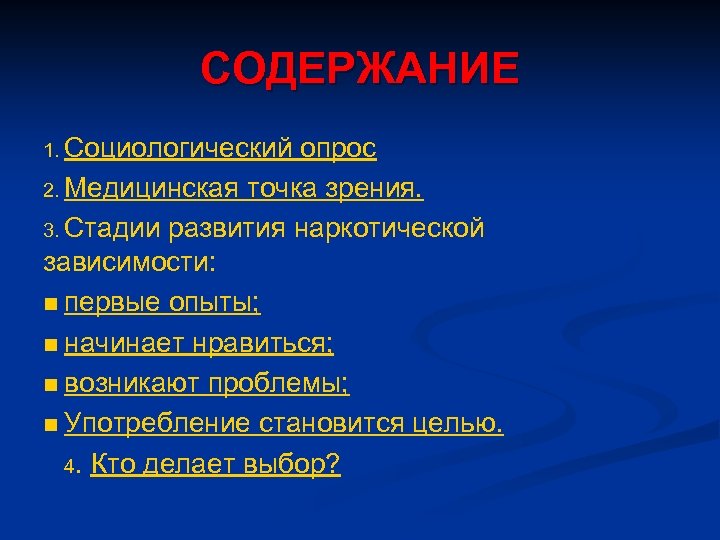 СОДЕРЖАНИЕ 1. Социологический опрос 2. Медицинская точка зрения. 3. Стадии развития наркотической зависимости: n первые опыты; n начинает нравиться; n возникают проблемы; n Употребление становится целью. 4. Кто делает выбор?
