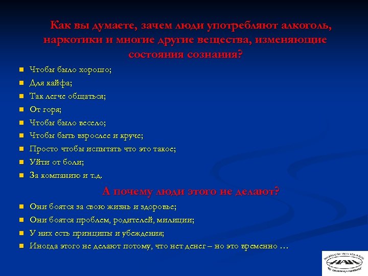 Как вы думаете, зачем люди употребляют алкоголь, наркотики и многие другие вещества, изменяющие состояния сознания? n n n n n Чтобы было хорошо; Для кайфа; Так легче общаться; От горя; Чтобы было весело; Чтобы быть взрослее и круче; Просто чтобы испытать что это такое; Уйти от боли; За компанию и т. д. А почему люди этого не делают? n n Они боятся за свою жизнь и здоровье; Они боятся проблем, родителей, милиции; У них есть принципы и убеждения; Иногда этого не делают потому, что нет денег – но это временно …