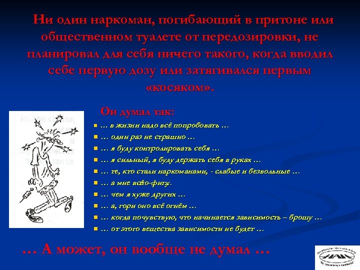 Ни один наркоман, погибающий в притоне или общественном туалете от передозировки, не планировал для себя ничего такого, когда вводил себе первую дозу или затягивался первым «косяком» . Он думал так: n … в жизни надо всё попробовать … … один раз не страшно … n … я буду контролировать себя … n … я сильный, я буду держать себя в руках … n … те, кто стали наркоманами, - слабые и безвольные … n … а мне всё по-фигу … n … чем я хуже других … n … а, гори оно всё огнём … n … когда почувствую, что начинается зависимость – брошу … n … от этого вещества зависимости не будет … n … А может, он вообще не думал …